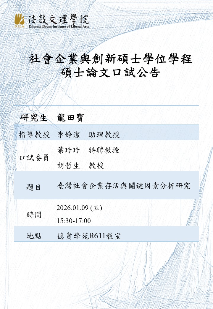 | 2026.01.09 龍田寶學位論文口試 題目:臺灣社會企業存活與關鍵因素分析研究 | 2025.12.18 |