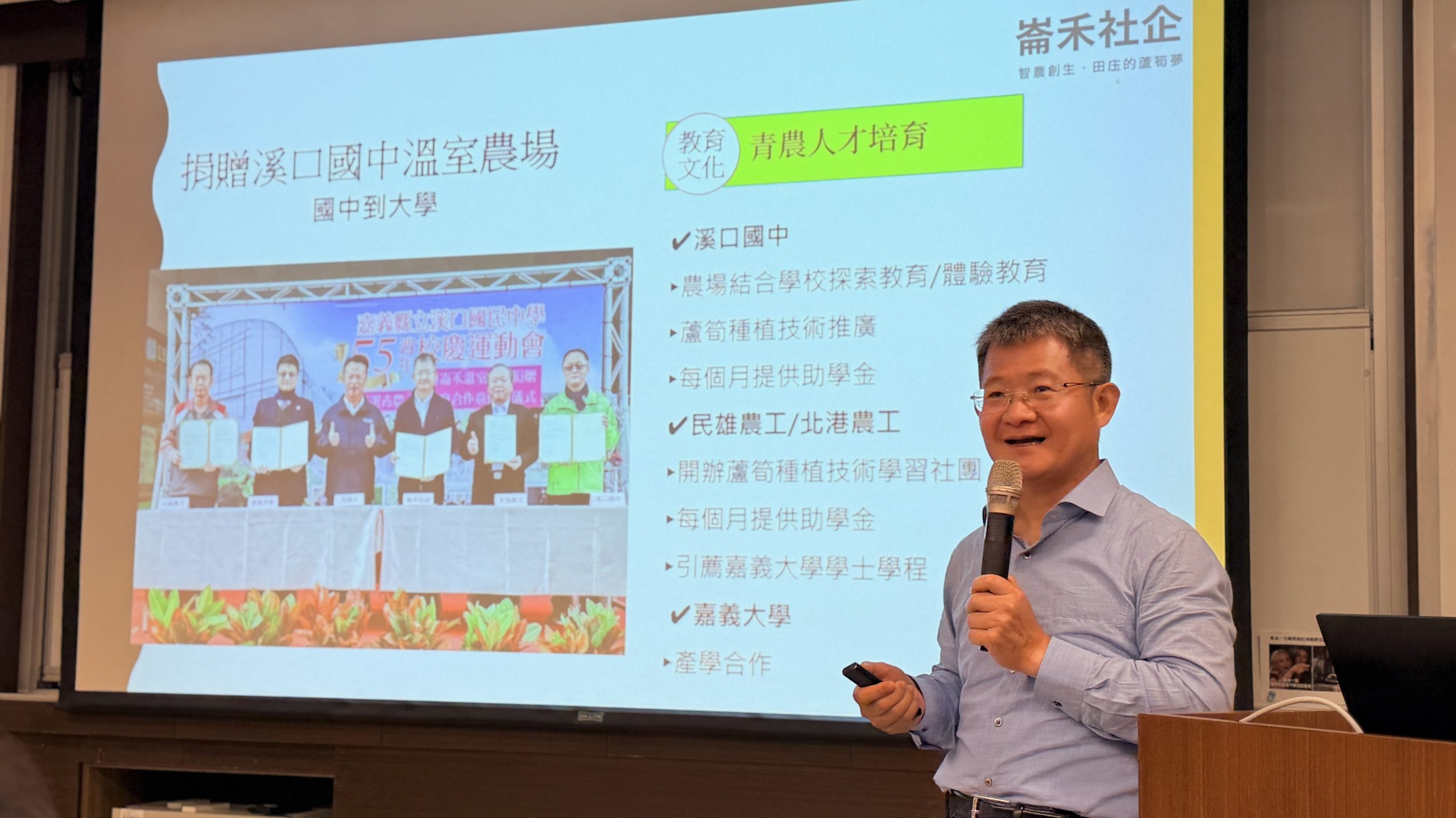 演講開場,陳董事長首先描繪了台灣傳統農村面臨的嚴峻挑戰:以嘉義溪口鄉為例,受限於傳統稻作的低微收入與「看天吃飯」的不可控性,導致年輕人口大量外流、農村老化凋零。